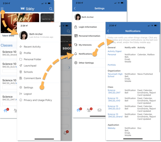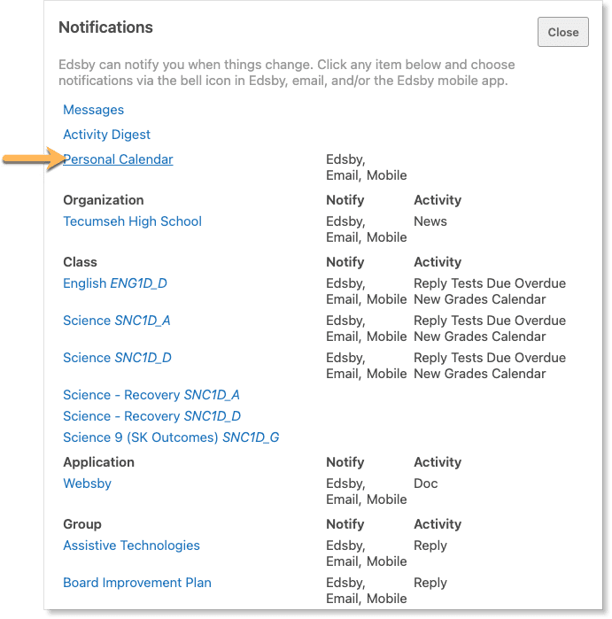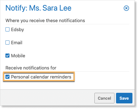 In this example, Beth Archer would like to receive Edsby and Mobile Notifications on her phone to remind her of events that she has entered into her Personal Calendar.