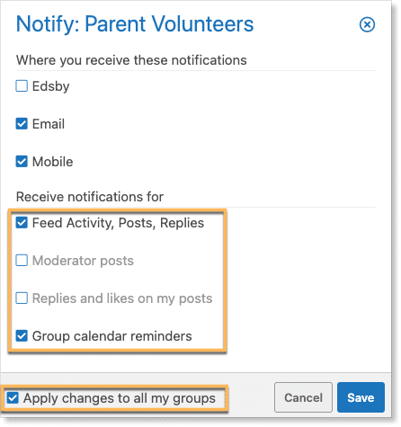 However, to specify which aspects of the feed to be notified of, specify using the other options. Boxes with check marks indicate the activities that the parent will receive notifications for. If the parent is a member of multiple groups, the Notification Settings for one group can be copied to all other groups by clicking the box next to Apply changes to all my groups.