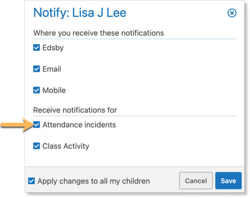 If a child is marked Late or Absent by any of their teachers and there is no Planned Absence listed for them, the Attendance Office may choose to notify their parents through Edsby. In order for parents to receive these notifications, they must enable them in their Notification Settings. Ensure the box next to Attendance Incidents is selected.