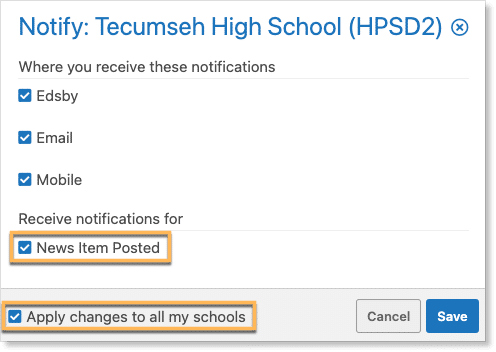 If parents have children at multiple schools, they can apply the Notification Settings to each of the schools their children attend by clicking the box next to Apply changes to all my schools. In this example, Pam Coughlan has children that attend both Elementary and High School and would like to receive notifications within Edsby whenever a new article has been posted to the school News River of any of the schools her children attend.