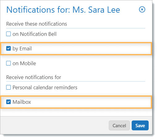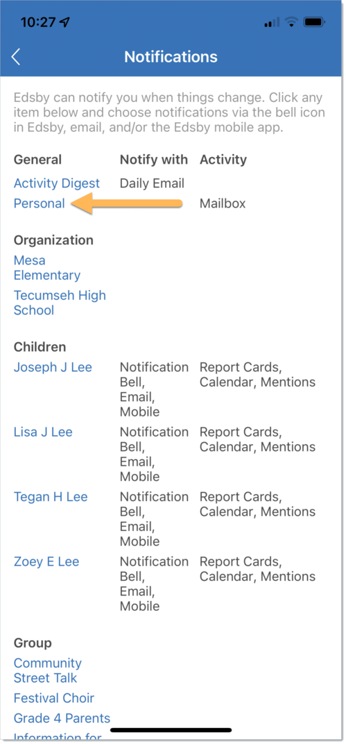 Parents have similar notification options to teachers and students, however, they can choose to be notified about their children in addition to their Personal Calendar, the school, and their Groups.