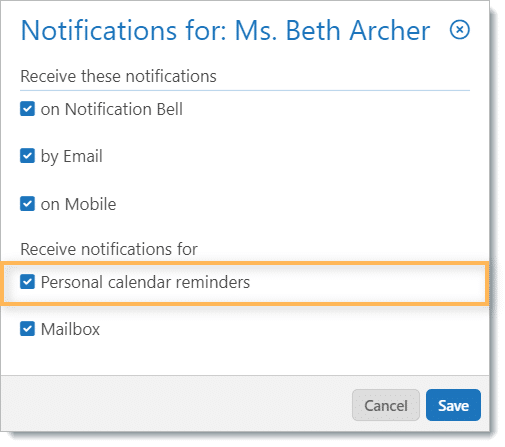 Teachers and students can be notified of reminders attached to events in their Personal Calendar.