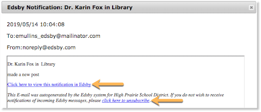 Users have the option to view the post that was made liked, or replied to in Edsby by clicking on the link that says ‘Click here to view this notification in Edsby’. Users can also choose to unsubscribe to Email Notifications by clicking the link that says ‘Click here to unsubscribe’.