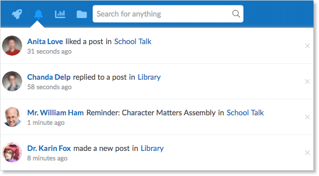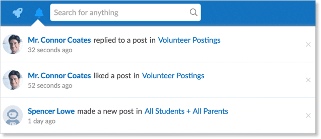 Notifications regarding a specific Organization, Group, or Class can also be updated by clicking the bell icon directly from within a School, Class, or Group Feed.