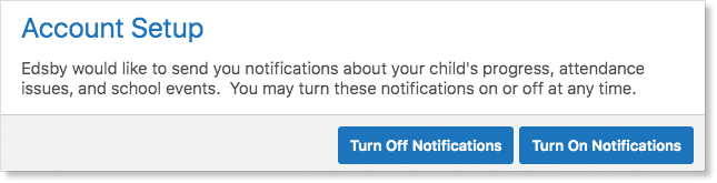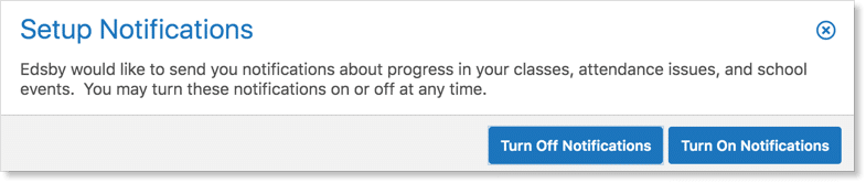When first logging in to an Edsby account, users will be prompted with the opportunity to turn on Notifications for their account.