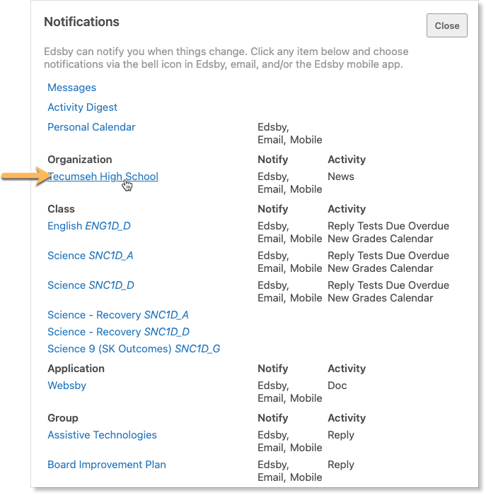 Note: If notifications are set on the browser, they will carry over onto a mobile device providing push notifications have been enabled for the Edsby App in the phone settings.