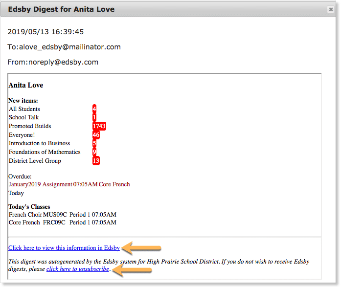 The information provided in the digest can be viewed by clicking the link that says ‘Click here to view this information in Edsby’. Teachers, students, and parents can also unsubscribe to Edsby digests by clicking the link that says ‘Click here to unsubscribe’.