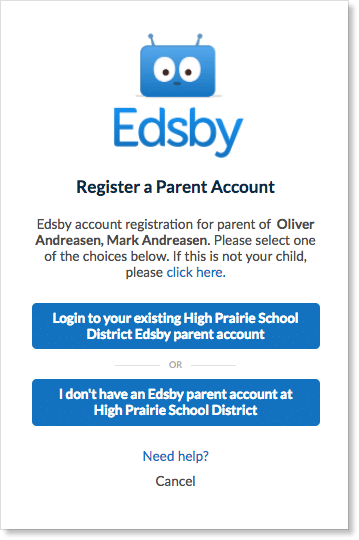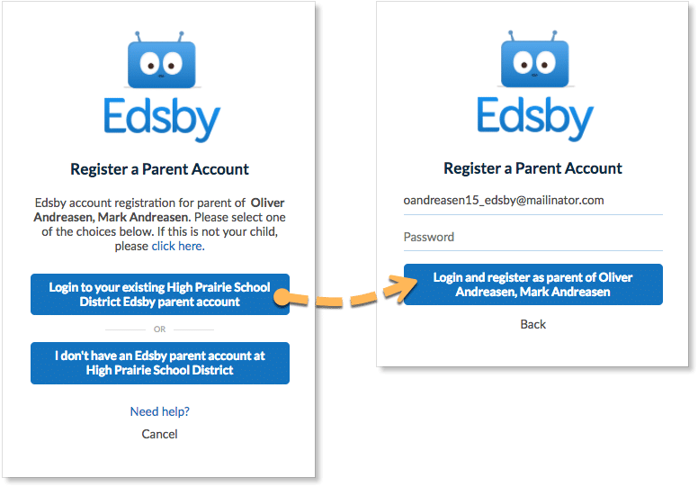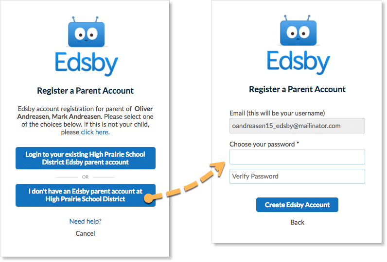 Parents only need one Edsby parent account but, will receive a separate email invitation from each school their children attend. Parents can click the link(s) in the email(s) they were sent, and a browser will send them to a screen like the one below on the left:
