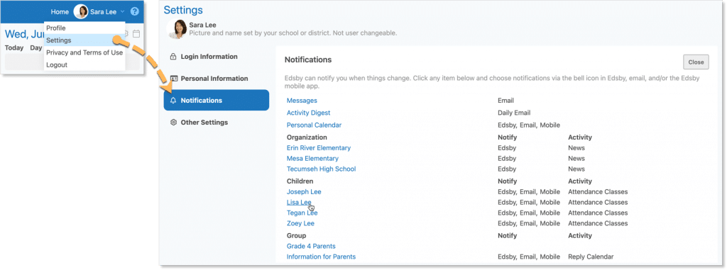 If a parent’s child is marked Late or Absent by any of their teachers and there is no Planned Absence listed for them, the Attendance Office may choose to notify their parents through Edsby. In order for parents to receive these notifications, they must enable them in their Notification Settings. Navigate to the Settings, select Notifications, and click a child’s name.