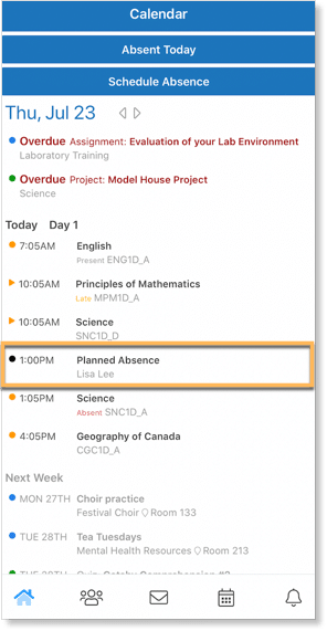 An approved absence will be visible in their child’s Personal Calendar by clicking Calendar under their name on the Home Screen.