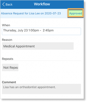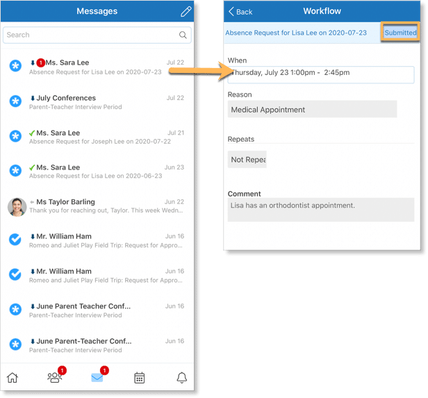 Once the school office has reviewed and approved the absence, the status of the receipt will change to Approved.