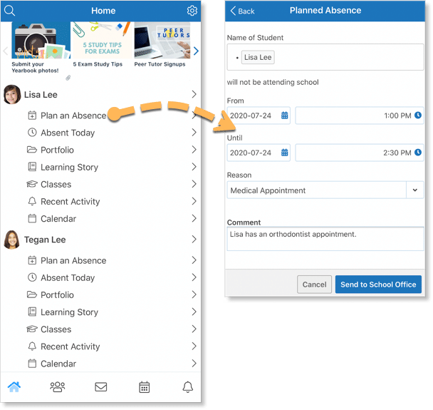 To submit a planned absence, scroll to the child the absence is for. Parents have two options when scheduling absences: Absent Today and Plan an Absence.