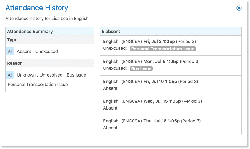 Here, parents can use the filters to view certain events regarding their child’s attendance in a specific class.
