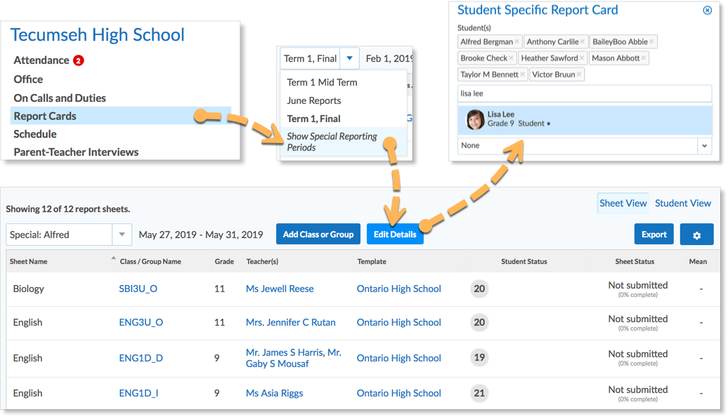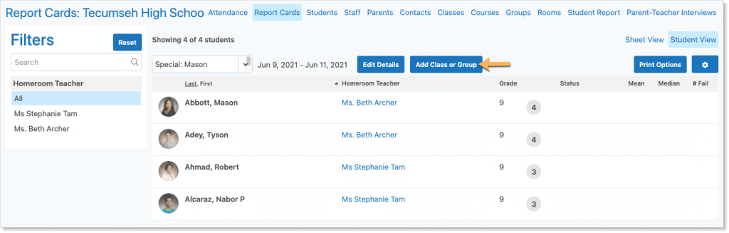 Click Save. Report Cards Zoom will appear. The students’ teachers will see a Report Card button on their home screens. Clicking the Report Card button opens the report card sheet. The teacher can also access the report card sheet by clicking the Report Card link within a Class.