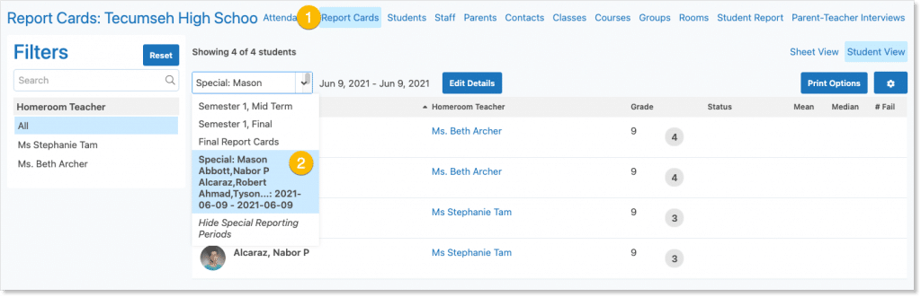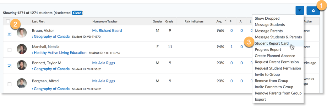 Once the students have been selected or filtered into a list, click the drop down button and select Student Report Card.