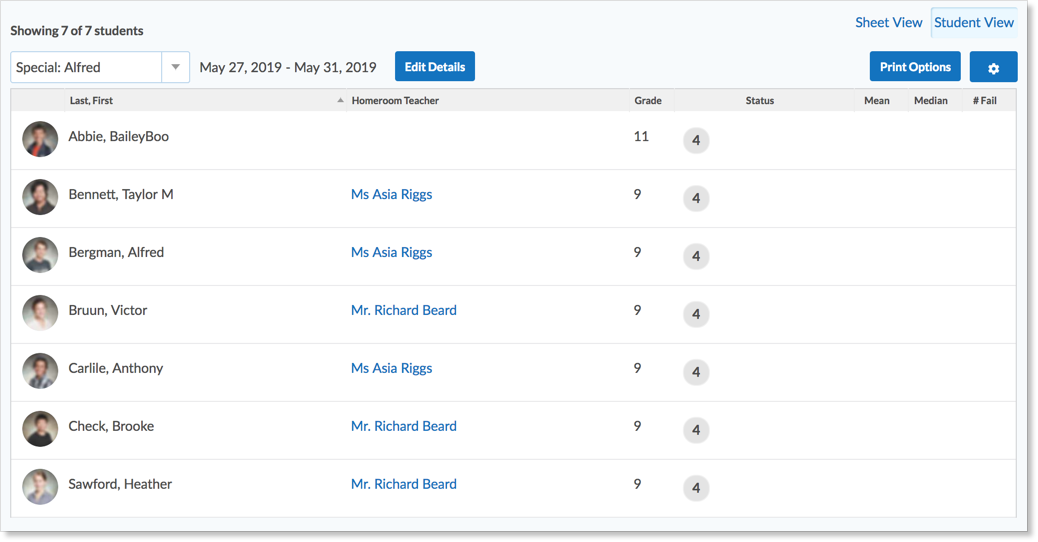 If the student has already left the school, click the drop down button and select Show dropped students. Filter the student list to the name of the student. Click the Gear icon to select a set of students.