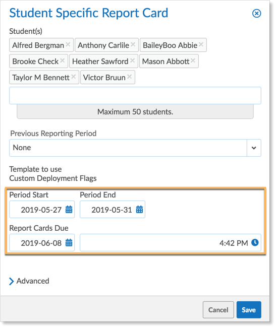 When a student leaves the school district or transfers to another school in the district, school administrators can provision a report card for the student. A report card can be provisioned before the student leaves the school or after the student has transferred. Student Specific Reports Cards can have a maximum of 50 students.