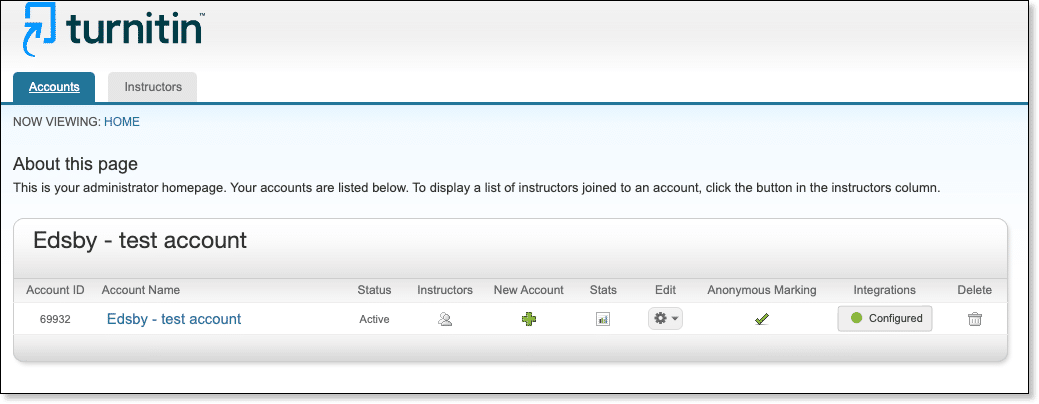 Log into the Administrator Account on Turnitin. From the Home page, click Configuration/Configured under Integration.
