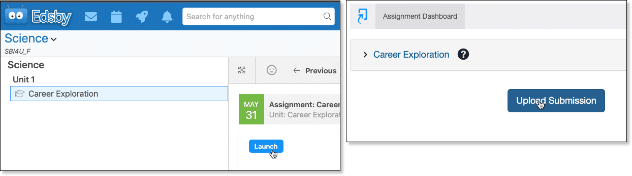 For students, once the assessment is made visible, the student sees a Launch button in the Class environment, Recent Activity, or the Calendar. By clicking on this button, Turnitin is opened, allowing the student to conveniently submit their files through the Turnitin platform.