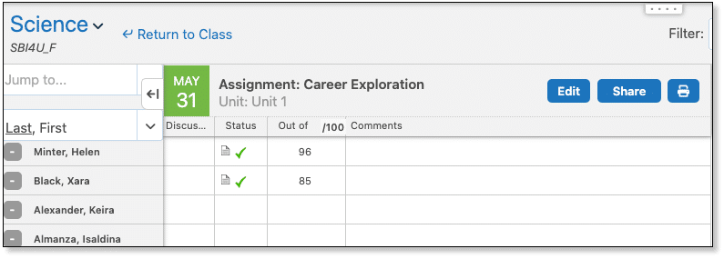 If the LTI Tool form’s Gradebook field has been set to Assessment management, grades entered in Turnitin will be visible in the Edsby Gradebook.