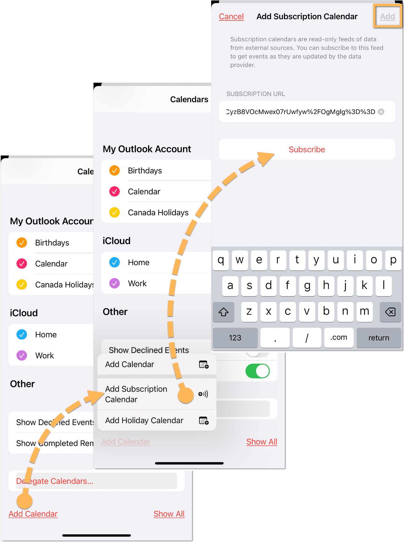 To sync your Edsby Calendar to your mobile calendar, copy the Edsby Calendar URL from your browser and send it to your mobile device. On an IOS device, copying the URL to your clipboard will allow you to paste from your mobile device. For android users, you can email the link to yourself and copy it from your mobile device. Once you have the link copied on your mobile device, navigate to your calendar and and tap Add Calendar. Choose Add Subscription Calendar and paste the URL, tap Add.